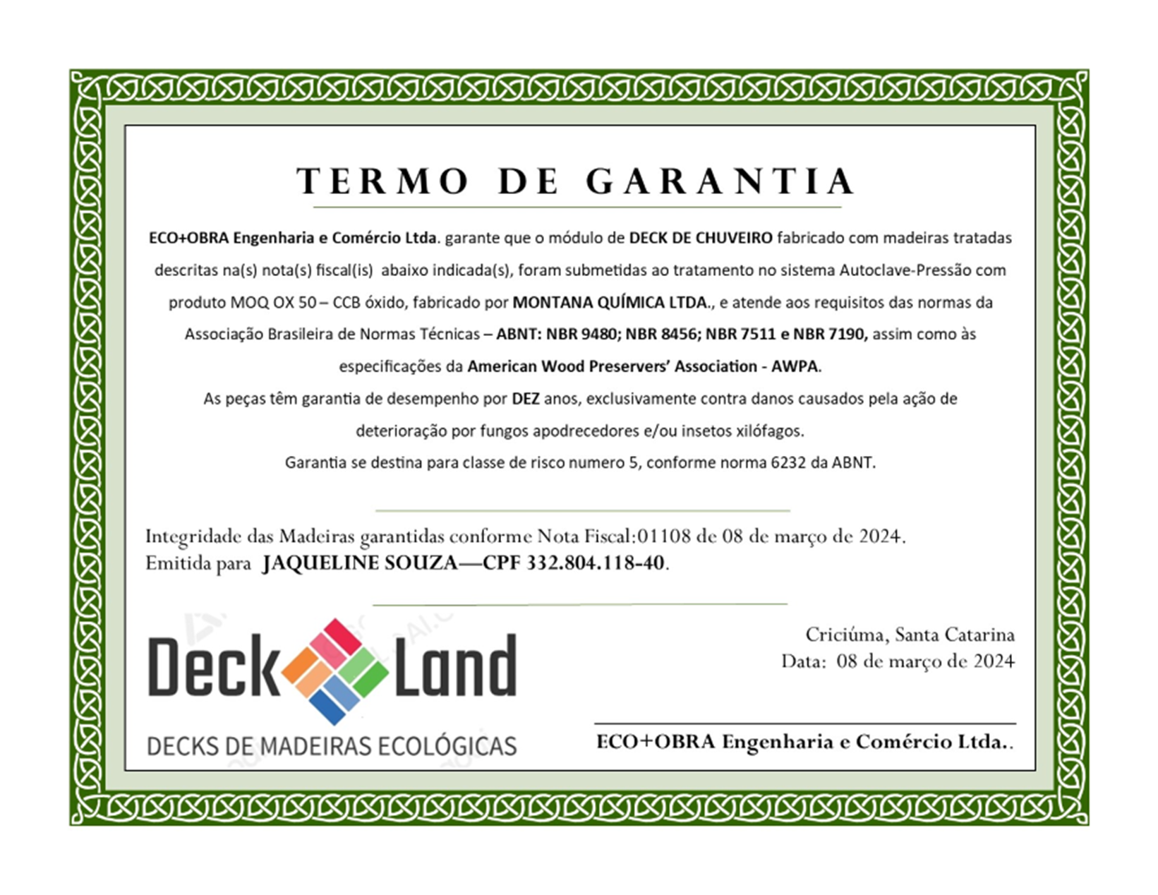 2 - Garantia das madeiras tratadas: 10 anos contra ataque de cupins e apodrecimento precoce.